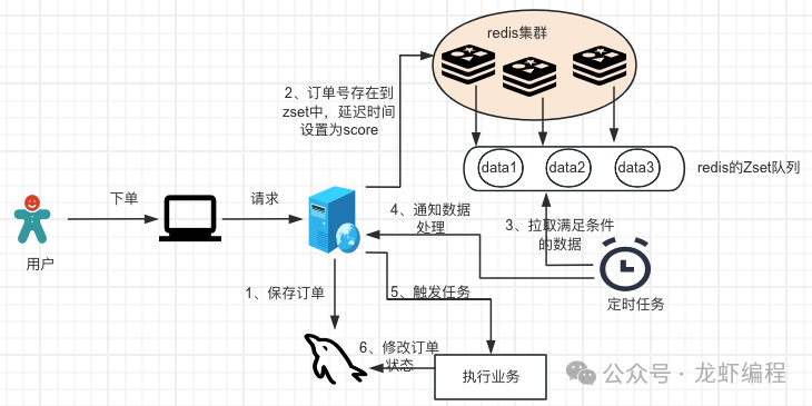 member设置为订单号;score设置为订单超时时间的时间戳(下单时间+超时时长);这样redis会对zset按照score延时时间进行排序。然后使用定时任务获取大于score值的任务,找到任务之后取出订单号,做相关的业务处理。