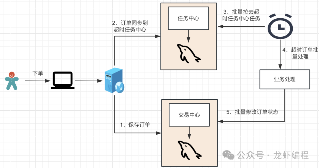 用户下单之后将订单数据保存在交易中心的订单库中,如果订单需要实现延时任务,此时将订单数据同步一份到任务中心中,任务中心的通过定时任务(如xxl-job、ElasticJob)来触发任务操作相关的逻辑。