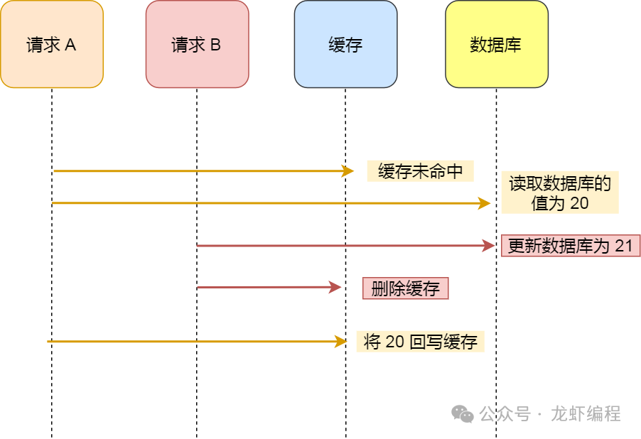 (3)线程A将缓存的值更新成20,但是20 不是数据库中的最新值,造成了数据库和缓存中的数据不一致的问题。