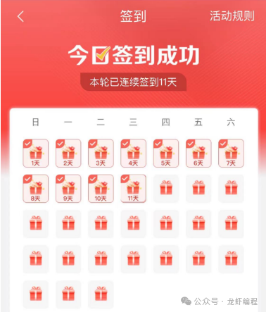 在我们日常玩的游戏中或一些银行类app上,他们为了提高用户的活跃度,设计了签到领取奖励的功能,当用户连续签到多少天之后我们可以获得相应的奖励,如下是某个app中签到页面: