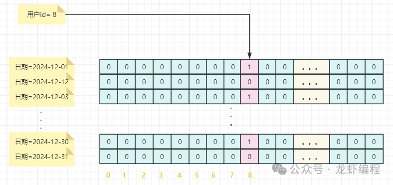 同样的道理,id为8的用户在12月份每天的签到数据都存储到这31个bitmap上,如下图所示:
