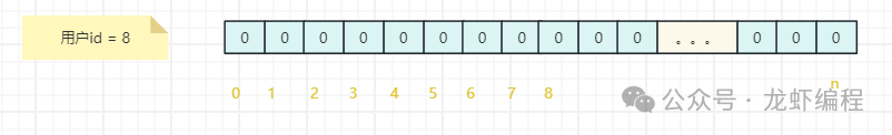 如果以日期为维度来存储签到数据,要统计12月份所有用户的连续签到,那么就需要31个bitmap就是可以实现。假设用户id等于8的用户签到了,我们将bitmap上8这个位置的0修改成1,如下所示: