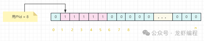 假设id为8的用户连续5天签到了,那么我们记录在bitmap中的数据如下所示: