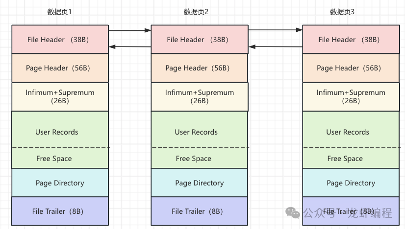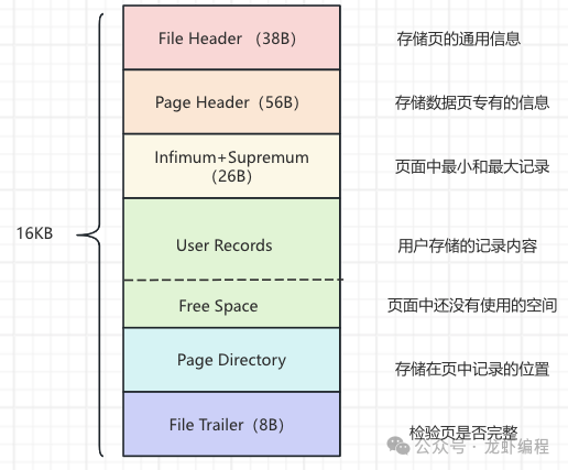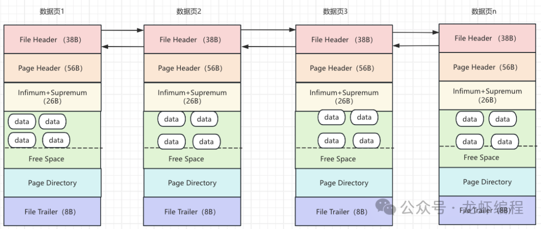 通常我们将存放表中数据记录的页称为数据页,将存放索引的数据页称为索引页,下图是数据页的结构图: