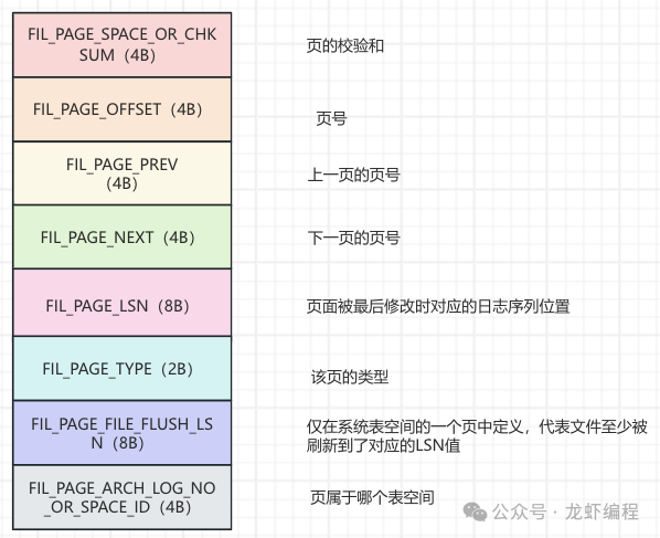 File Header针对各种类型的页都通用,主要是描述一些通用信息,如当前的页编号信息,当前页的上一页、下一页的信息等等。如下是File Header的具体信息:
