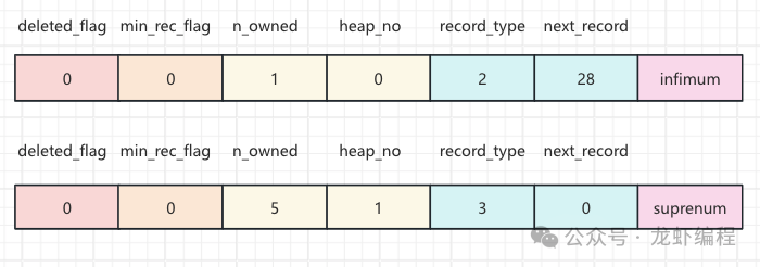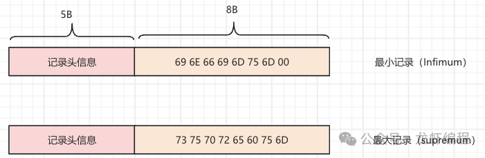 由于这两条记录是Mysql自动生成的,所以并不存放在page页的User Records部分,而是被单独放在一个称为Infimum+Supremum的部分,下图展示了两个记录存储的信息: