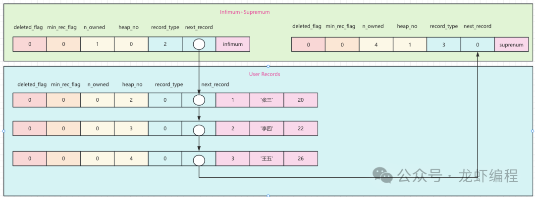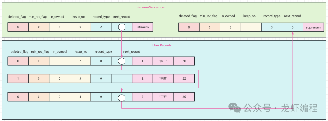 最大记录和最小记录分别的heap_no值是1、0,那么真实的数据记录heap就是从2开始统计,如下是行数据之间的关系: