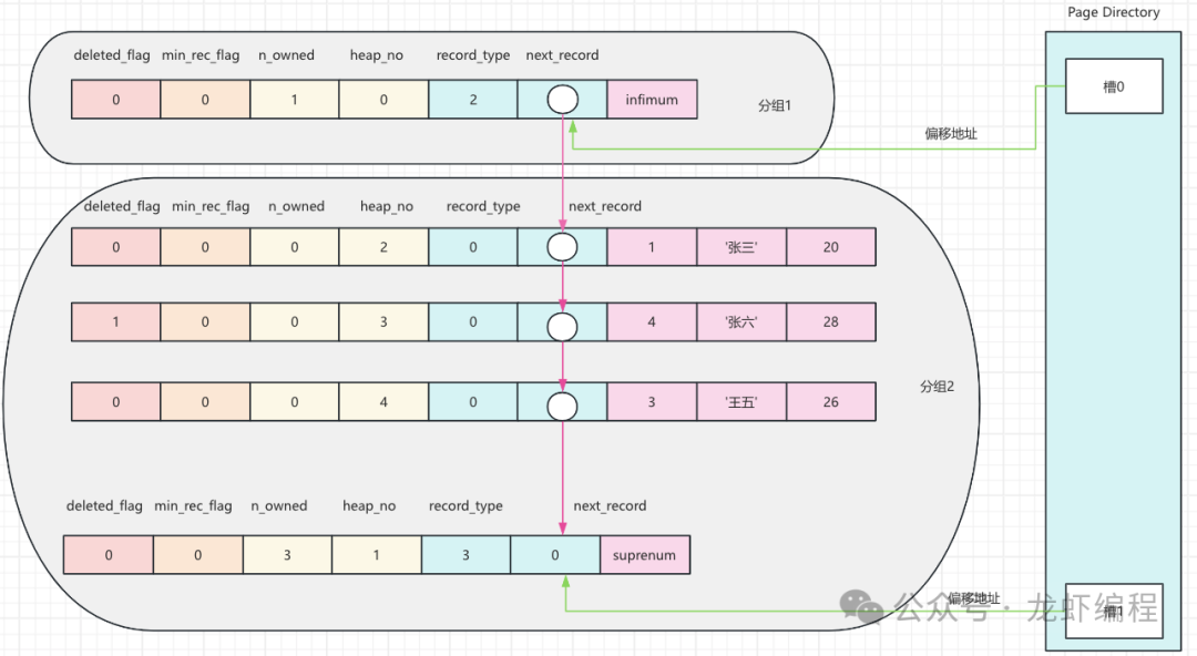 Page Directory分组规则:Infimum记录所在的分组只能有一条记录(该分组只有Infimum);Supremum记录所在的分组只能在1~8条记录之间;剩下的其他记录所在的分组只能在4~8条记录之间。这样的目的在于除了第一组之外其余的组中数据基本是平均分配的。