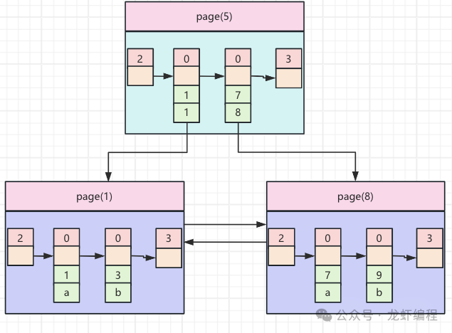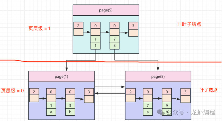 这个新的数据页(page5)和之前的数据页(page1和page8)结构没有什么太大的区别,新生成的page页大小依然是16kb,同时为了与之前的数据做区分,新的数据页中加入页层级的信息并取个名字叫索引页,如下所示: