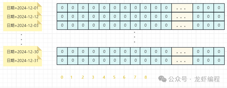 如果要统计用户在12月份的连续签到次数,我们设置key为日期,用户的id作为bitmap上的偏移位,如下所示: