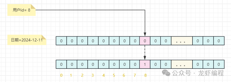 如果以日期为维度来存储签到数据,要统计12月份所有用户的连续签到,那么就需要31个bitmap就是可以实现。假设用户id等于8的用户签到了,我们将bitmap上8这个位置的0修改成1,如下所示: