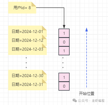 同样的道理,id为8的用户在12月份每天的签到数据都存储到这31个bitmap上,如下图所示: