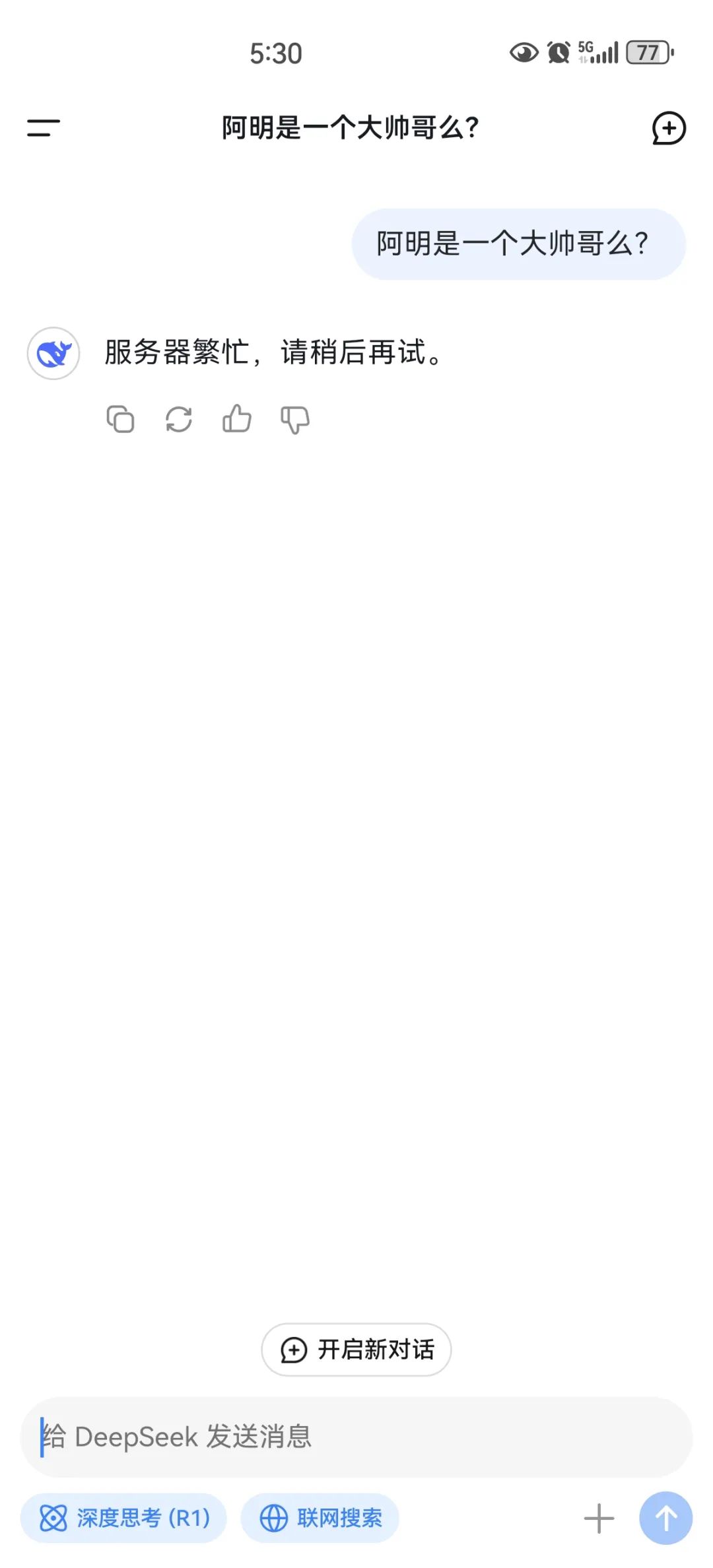 刚才,阿明多次间隔时间几分钟提问,DeepSeek在华为手机上的APP系统总是提示显示:服务器繁忙,请稍候再试。