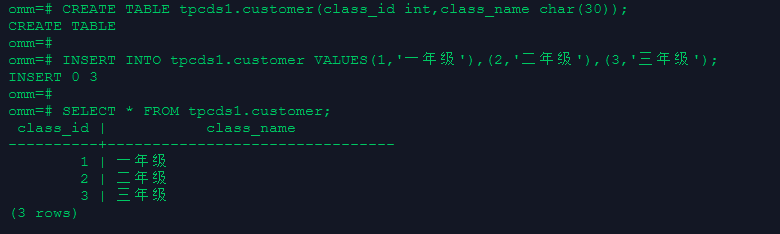 INSERT INTO tpcds1.customer VALUES(1,'一年级'),(2,'二年级'),(3,'三年级');