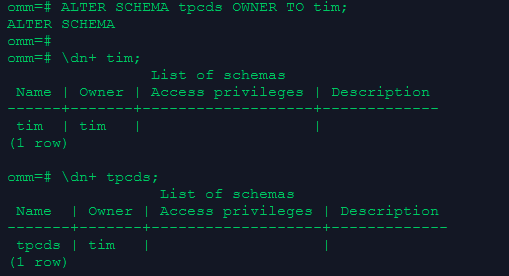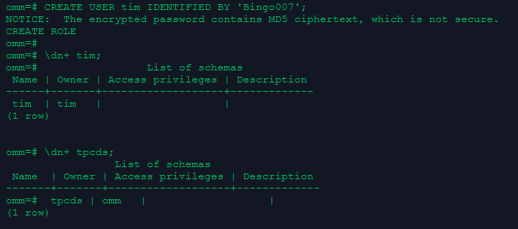 2.创建一个用户tim, 并将tpcds的owner修改为tim,且修改owner前后分别使用\dn+查看模式信息