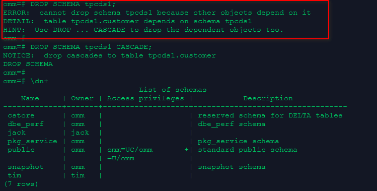 DROP SCHEMA ds_new;–当schema非空时,如果要删除一个schema及其包含的所有对象,需要使用CASCADE关键字