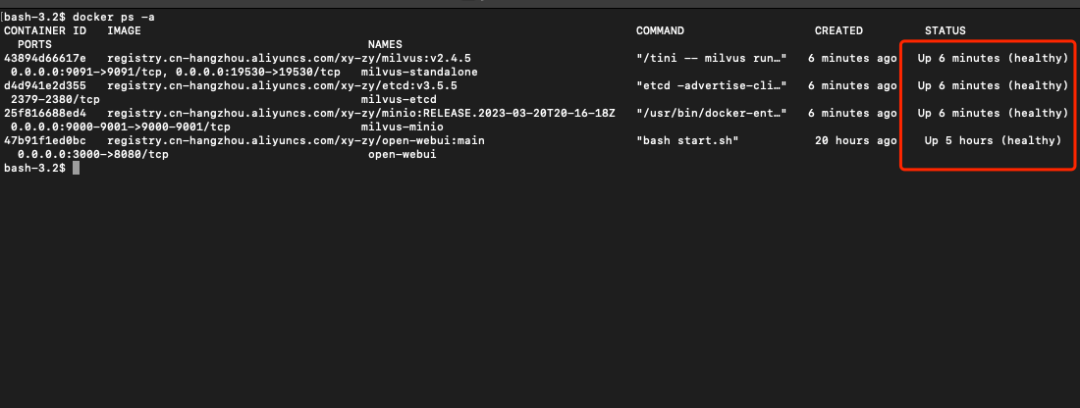 version: '3.5'services:etcd:container_name: milvus-etcdimage: registry.cn-hangzhou.aliyuncs.com/xy-zy/etcd:v3.5.5environment:- ETCD_AUTO_COMPACTION_MODE=revision- ETCD_AUTO_COMPACTION_RETENTION=1000- ETCD_QUOTA_BACKEND_BYTES=4294967296- ETCD_SNAPSHOT_COUNT=50000volumes:- ${DOCKER_VOLUME_DIRECTORY:-.}/volumes/etcd:/etcdcommand: etcd -advertise-client-urls=http://127.0.0.1:2379 -listen-client-urls http://0.0.0.0:2379 --data-dir /etcdhealthcheck:test: ["CMD", "etcdctl", "endpoint", "health"]interval: 30stimeout: 20sretries: 3minio:container_name: milvus-minioimage: registry.cn-hangzhou.aliyuncs.com/xy-zy/minio:RELEASE.2023-03-20T20-16-18Zenvironment:MINIO_ACCESS_KEY: minioadminMINIO_SECRET_KEY: minioadminports:- "9001:9001"- "9000:9000"volumes:- ${DOCKER_VOLUME_DIRECTORY:-.}/volumes/minio:/minio_datacommand: minio server /minio_data --console-address ":9001"healthcheck:test: ["CMD", "curl", "-f", "http://localhost:9000/minio/health/live"]interval: 30stimeout: 20sretries: 3standalone:container_name: milvus-standaloneimage: registry.cn-hangzhou.aliyuncs.com/xy-zy/milvus:v2.5.4command: ["milvus", "run", "standalone"]security_opt:- seccomp:unconfinedenvironment:ETCD_ENDPOINTS: etcd:2379MINIO_ADDRESS: minio:9000COMMON_USER: milvusCOMMON_PASSWORD: milvusvolumes:- ${DOCKER_VOLUME_DIRECTORY:-.}/volumes/milvus:/var/lib/milvushealthcheck:test: ["CMD", "curl", "-f", "http://localhost:9091/healthz"]interval: 30sstart_period: 90stimeout: 20sretries: 3ports:- "19530:19530"- "9091:9091"depends_on:- "etcd"- "minio"networks:default:name: milvus