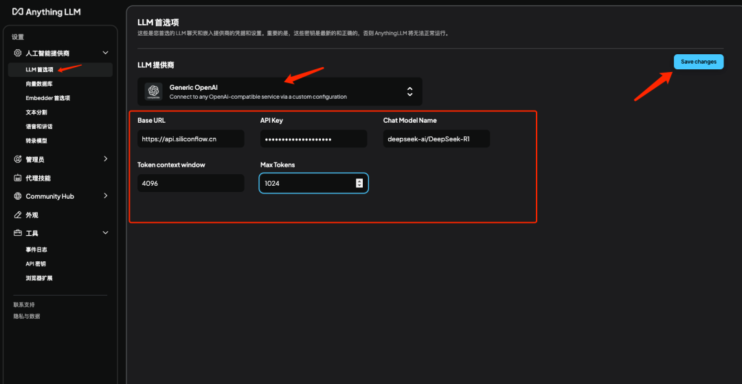 说明:点击LLM首选项选择提供商Generic OpenAI并填入刚才注册的API密钥、baserul、deepseek模型名称并保存