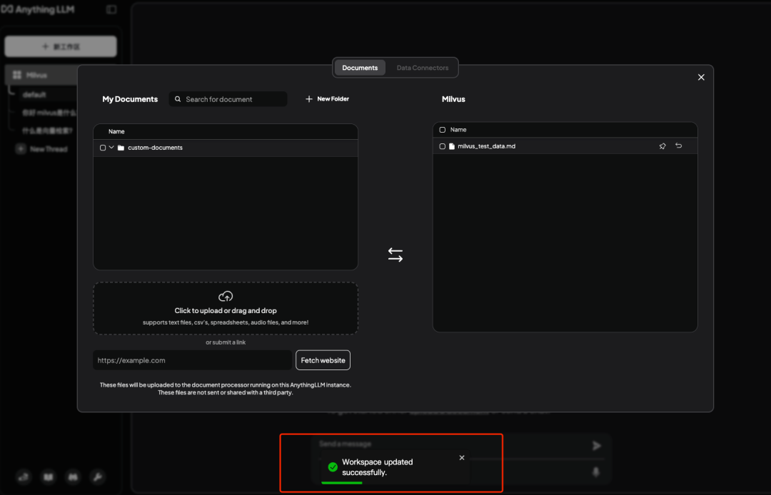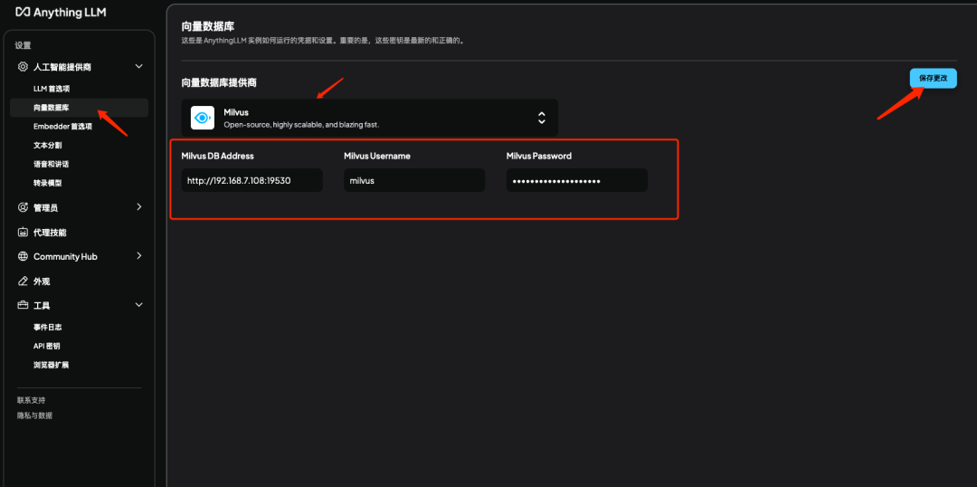 说明:点击向量数据库选项选择Milvus并填入刚才部署好的milvus的地址、用户名、密码并保存