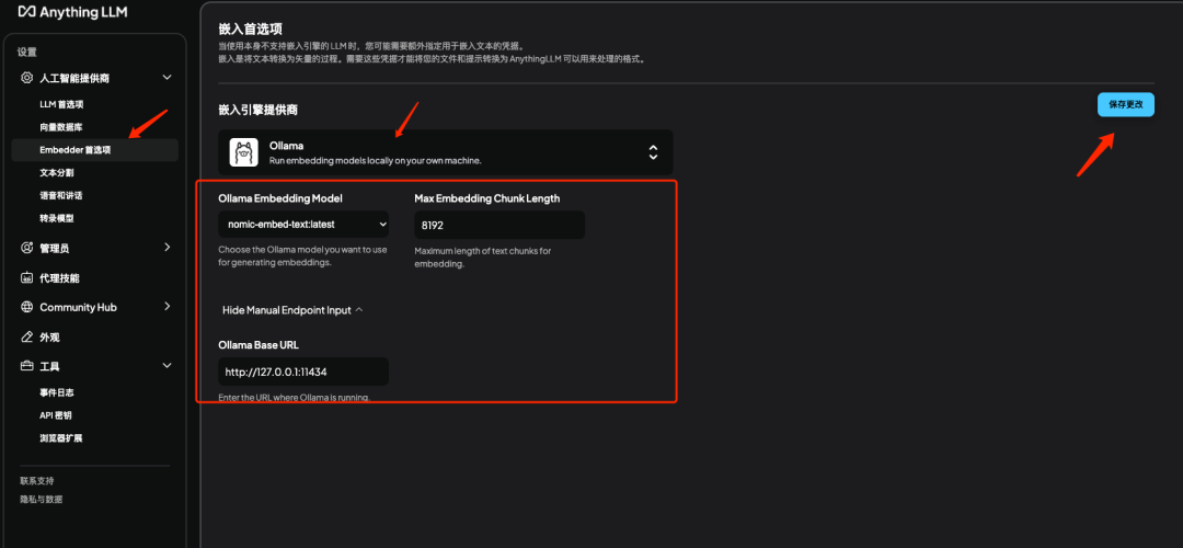 说明:点击Embedder首选项选择ollama并填入刚才部署好的ollama的URL和模型名称并保存