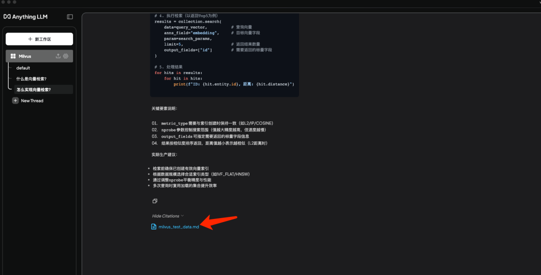 说明:对话框中输入“怎么实现向量检索检索?”得到的回复是符合预期的,可以看到回复中引用了本地知识库中的内容。
