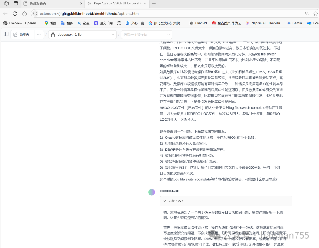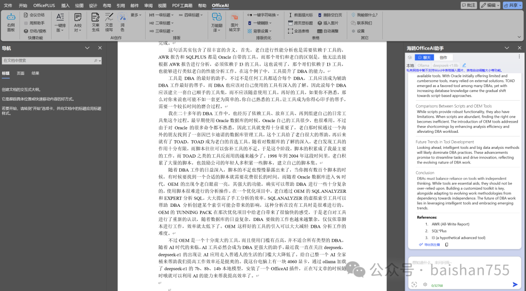 虽然OEM目前还是我最喜欢使用的Oracle运维工具之一,不过OEM是一个十分庞大的工具,而且使用门槛有点高,并不适合所有类型的DBA。随着AI时代的来临,AI工具必然会成为DBA更强大的助手。最近我一直在关注deepseek,deepseek-r1的出现让AI应用走入普通人的生活的门槛大大降低了。给自己整一个AI全家桶来帮助我们提高工作效率还是挺爽的。我这台电脑上有一块4060显卡,通过ollama加载了deepseek-r1的7b、8b、14b本地模型,安装了一个OfficeAI插件,正在写文章的时候随时可以利用AI的能力来帮我提高效率了。