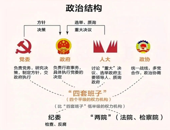 我国的政治体制可以概括为"四套班子",包括党委、政府、人大和政协这几个评级的权力机构,共同组成中央到地方的权力架构。全国人民代表大会这一最高权力机关下面,又形成了行政权、监察权、司法权三种权力,分别掌握在政府、监察委员会、法院、检察院四大机关手上,俗称"一府一委两院"。