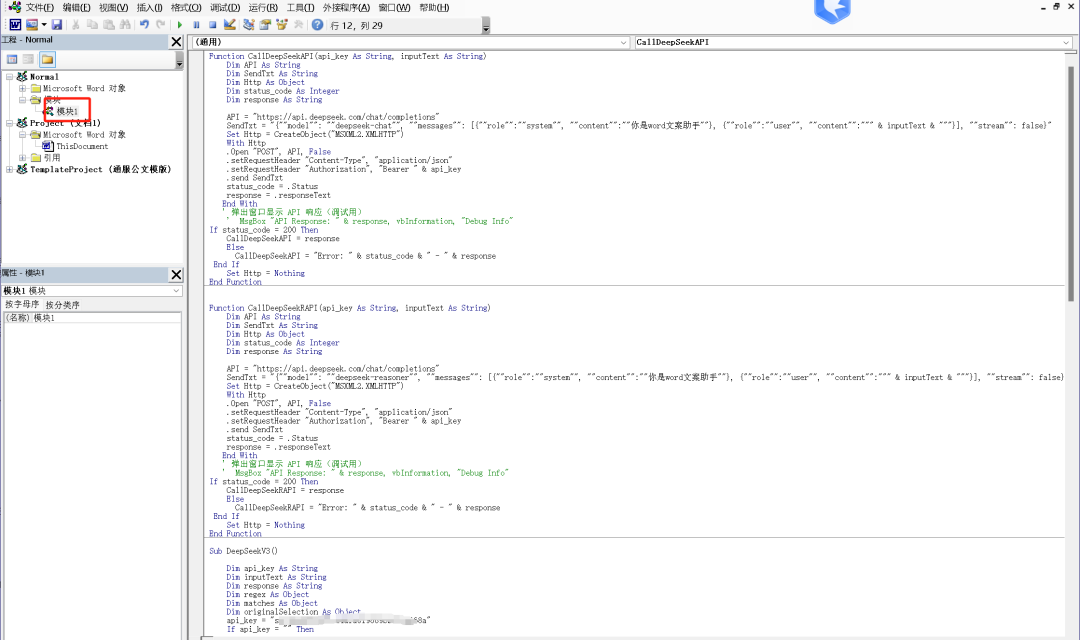 Function CallDeepSeekAPI(api_key As String, inputText As String)Dim API As StringDim SendTxt As StringDim Http As ObjectDim status_code As IntegerDim response As StringAPI = "https://api.deepseek.com/chat/completions"SendTxt = "{""model"": ""deepseek-chat"", ""messages"": [{""role"":""system"", ""content"":""你是word文案助手""}, {""role"":""user"", ""content"":""" & inputText & """}], ""stream"": false}"Set Http = CreateObject("MSXML2.XMLHTTP")With Http.Open "POST", API, False.setRequestHeader "Content-Type", "application/json".setRequestHeader "Authorization", "Bearer " & api_key.send SendTxtstatus_code = .Statusresponse = .responseTextEnd WithIf status_code = 200 ThenCallDeepSeekAPI = responseElseCallDeepSeekAPI = "Error: " & status_code & " - " & responseEnd IfSet Http = NothingEnd FunctionFunction CallDeepSeekRAPI(api_key As String, inputText As String)Dim API As StringDim SendTxt As StringDim Http As ObjectDim status_code As IntegerDim response As StringAPI = "https://api.deepseek.com/chat/completions"SendTxt = "{""model"": ""deepseek-reasoner"", ""messages"": [{""role"":""system"", ""content"":""你是word文案助手""}, {""role"":""user"", ""content"":""" & inputText & """}], ""stream"": false}"Set Http = CreateObject("MSXML2.XMLHTTP")With Http.Open "POST", API, False.setRequestHeader "Content-Type", "application/json".setRequestHeader "Authorization", "Bearer " & api_key.send SendTxtstatus_code = .Statusresponse = .responseTextEnd WithIf status_code = 200 ThenCallDeepSeekRAPI = responseElseCallDeepSeekRAPI = "Error: " & status_code & " - " & responseEnd IfSet Http = NothingEnd FunctionSub DeepSeekV3()Dim api_key As StringDim inputText As StringDim response As StringDim regex As ObjectDim matches As ObjectDim originalSelection As Objectapi_key = "你的APIKEY"If api_key = "" ThenMsgBox "Please enter the API key."Exit SubElseIf Selection.Type <> wdSelectionNormal ThenMsgBox "请选择文本."Exit SubEnd If' 保存原始选中的文本Set originalSelection = Selection.Range.DuplicateinputText = Replace(Replace(Replace(Replace(Replace(Selection.Text, "\", "\\"), vbCrLf, ""), vbCr, ""), vbLf, ""), Chr(34), "\""")response = CallDeepSeekAPI(api_key, inputText)If Left(response, 5) <> "Error" ThenSet regex = CreateObject("VBScript.RegExp")With regex.Global = True.MultiLine = True.IgnoreCase = False.Pattern = """content"":""(.*?)"""End WithSet matches = regex.Execute(response)If matches.Count > 0 Thenresponse = matches(0).SubMatches(0)response = Replace(Replace(response, """", Chr(34)), """", Chr(34))response = Replace(response, "\n", vbCrLf)response = Replace(response, "\n", vbCrLf)response = Replace(response, "*", "")response = Replace(response, "#", "")' 取消选中原始文本Selection.Collapse Direction:=wdCollapseEnd' 将内容插入到选中文字的下一行Selection.TypeParagraph ' 插入新行Selection.TypeText Text:=response' 将光标移回原来选中文本的末尾originalSelection.SelectElseMsgBox "Failed to parse API response.", vbExclamationEnd IfElseMsgBox response, vbCriticalEnd IfEnd SubSub DeepSeekR()Dim api_key As StringDim inputText As StringDim response As StringDim regex As ObjectDim matches As ObjectDim originalSelection As Objectapi_key = "你的APIKEY"If api_key = "" ThenMsgBox "Please enter the API key."Exit SubElseIf Selection.Type <> wdSelectionNormal ThenMsgBox "请选择文本."Exit SubEnd If' 保存原始选中的文本Set originalSelection = Selection.Range.DuplicateinputText = Replace(Replace(Replace(Replace(Replace(Selection.Text, "\", "\\"), vbCrLf, ""), vbCr, ""), vbLf, ""), Chr(34), "\""")response = CallDeepSeekRAPI(api_key, inputText)If Left(response, 5) <> "Error" ThenSet regex = CreateObject("VBScript.RegExp")With regex.Global = True.MultiLine = True.IgnoreCase = False.Pattern = """content"":""(.*?)"""End WithSet matches = regex.Execute(response)If matches.Count > 0 Thenresponse = matches(0).SubMatches(0)response = Replace(Replace(response, """", Chr(34)), """", Chr(34))response = Replace(response, "\n", vbCrLf)response = Replace(response, "*", "")response = Replace(response, "#", "")' 取消选中原始文本Selection.Collapse Direction:=wdCollapseEnd' 将内容插入到选中文字的下一行Selection.TypeParagraph ' 插入新行Selection.TypeText Text:=response' 将光标移回原来选中文本的末尾originalSelection.SelectElseMsgBox "Failed to parse API response.", vbExclamationEnd IfElseMsgBox response, vbCriticalEnd IfEnd Sub