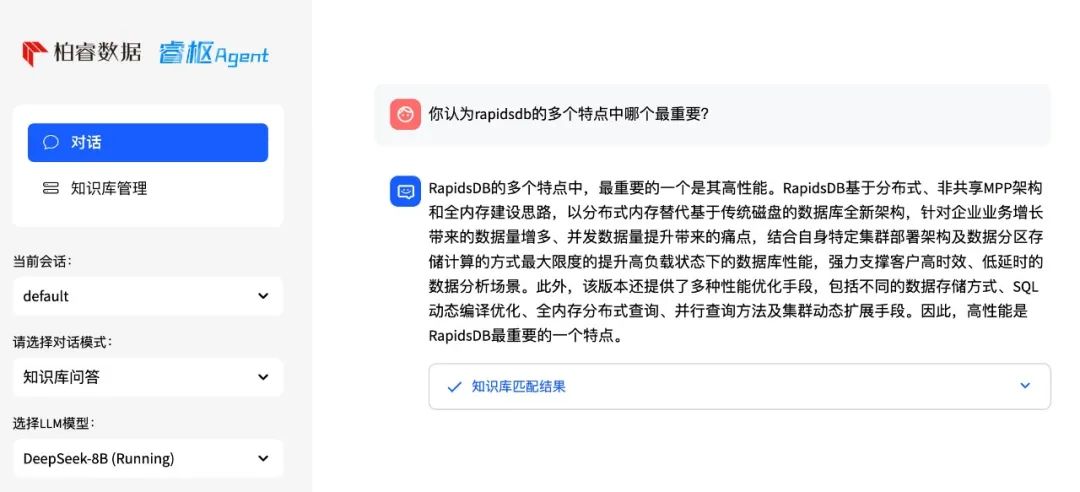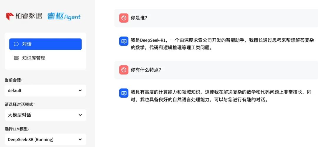 在柏睿AI知识库一体机中,DeepSeek提供了强大的语言理解和生成基础,专有知识向量大脑为其补充了个性化、专业的知识匹配,睿枢Agent则让整个系统能够与用户进行自然、流畅的交互。