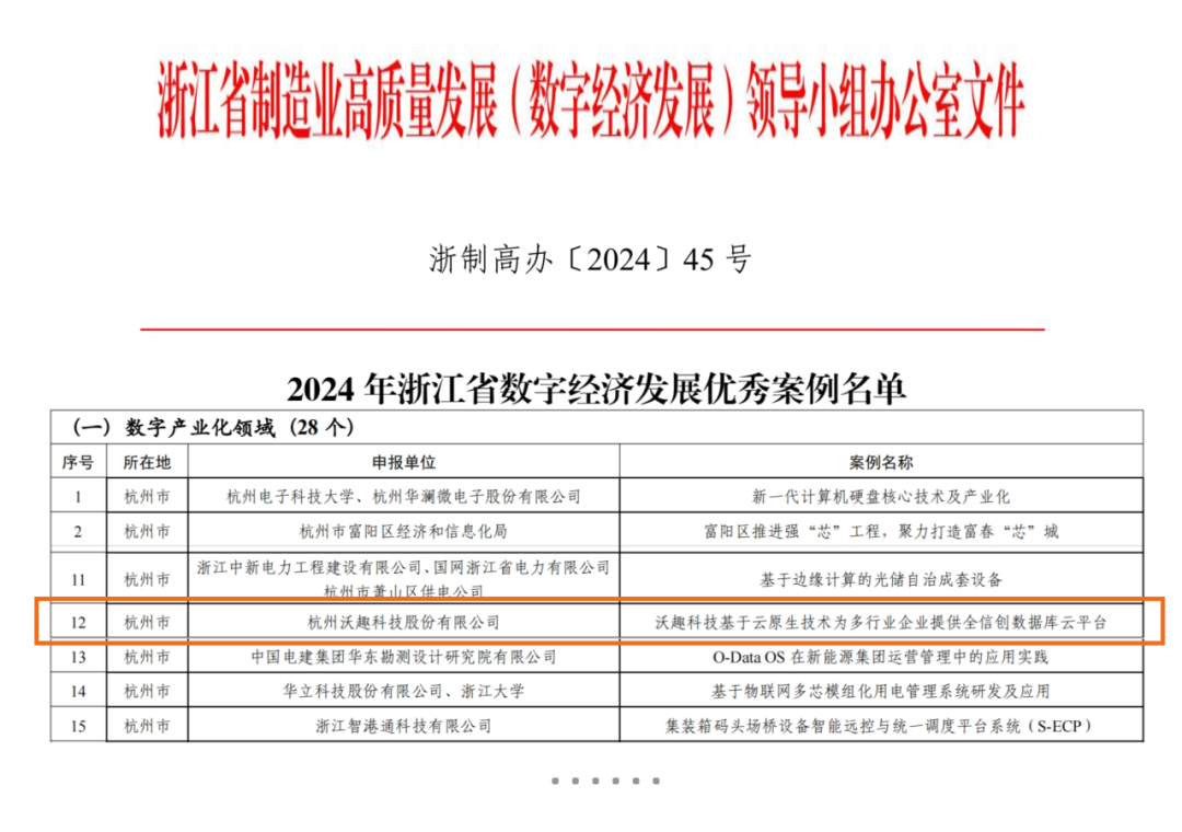 近日,浙江省经信厅正式公布了2024年浙江省数字经济发展优秀案例名单,沃趣科技全信创数据库云平台凭借在多个行业的优秀实践与标杆化创新成功入选。