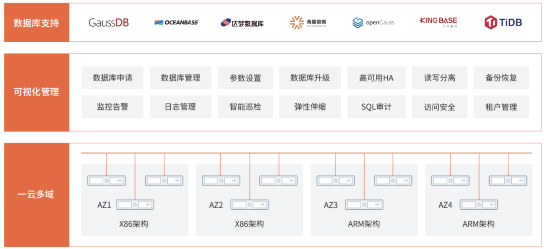 沃趣QFusion-C全信创数据库私有云RDS依托云原生架构,整合了计算、存储等基础资源,构建了一个高效、稳定、可弹性扩容的企业级数据库服务平台。平台采用容器化技术与Kubernetes架构,能够实现多类型国产数据库的全生命周期统一管理。用户通过DBaaS自助式服务,不仅能够快速申请和分配已有软硬件资源,还能灵活部署包括OceanBase、人大金仓、GaussDB、openGauss、TiDB、达梦等多种主流国产数据库实例,从而满足金融、医疗、教育、制造、能源、交通、政务等多个行业的业务需求。