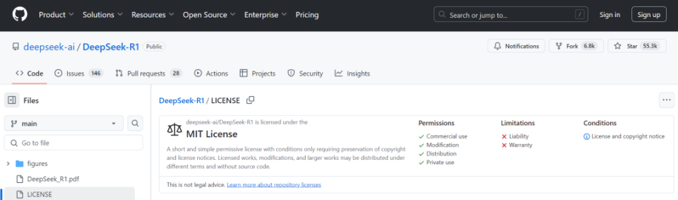 DeepSeek 采用商业友好的 MIT 许可证,也已经把模型架构和参数开源,通过技术报告和论文的形式,将训练算法、目标函数等技术细节公布,没有对下游应用进行限制。