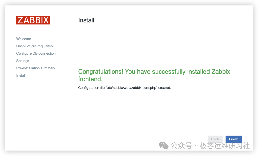 🎉 Zabbix Server 配置完成,点击 Finish 完成安装。