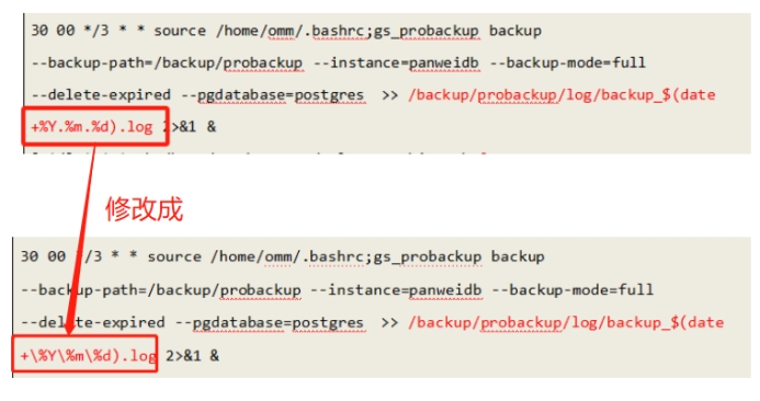 磐维数据库备份策略部署中,定时任务中时间格式.与\的区别