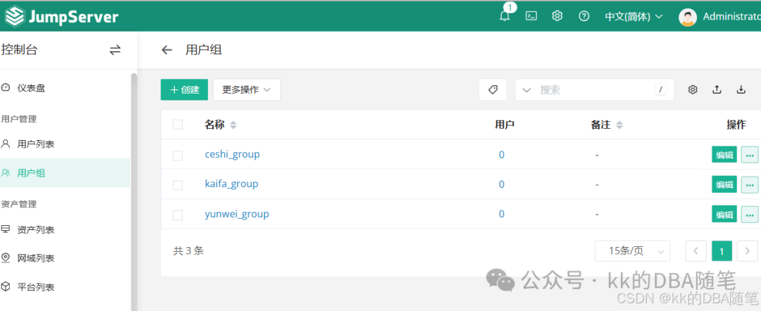 创建三个用户组:这个用户组可以看作 连接到 JumpServer 账号的角色(岗位),这里我们创建三个组(开发,测试,运维)