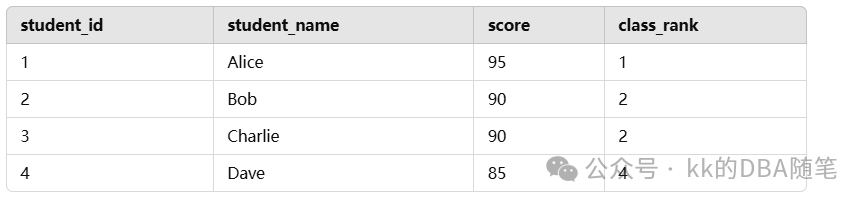 SELECTstudent_id,student_name,score,RANK() OVER (ORDER BY score DESC) AS class_rankFROMstudents;