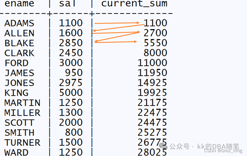 select ename,sal,SUM(sal) over (ORDER BY ename) as current_sum