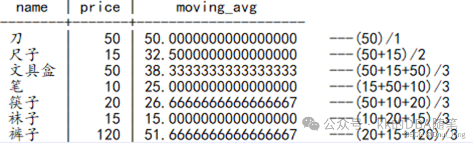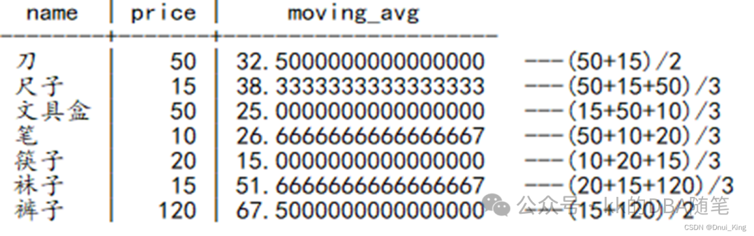 select name,price,avg (price) over (order by name rows 2 preceding) as moving_avg from product;