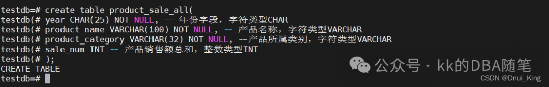 create table product_sale_all(year CHAR(25) NOT NULL, -- 年份字段,字符类型CHAR