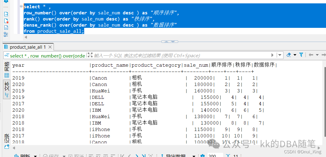 OVER 子句中的 ORDER BY 只是用来决定窗口函数按照什么样的顺序进行计算的,对结果的排列顺序并没有影响。在 SELECT 语句的最后,使用 ORDER BY 子句进行指定按照 ranking 列进行排列,结果才会顺序显示,但是如果使用了,会打乱原本窗口函数出来的显示结果。