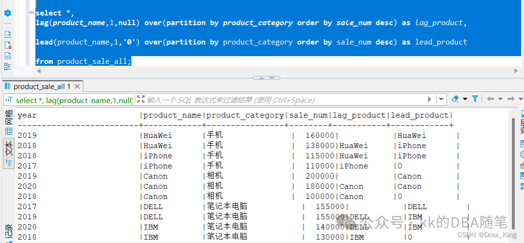 如果我们按产品类别进行分组,组内按照销售额进行逆序排序,针对每一行,计算销售额排名前1位lag_product 和后1位产品lead_product:
