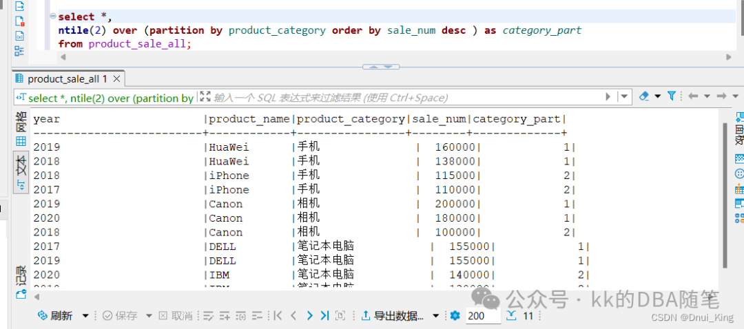 ntile(n) 可以奖数据按照顺序划分为N组,各个组有编号,编号从1开始,对于每一行,ntile返回此行所属的组的编号,ntile(2)表示将表切分为2组,ntile也可以在partition by 分组后分箱,表示对当前的组内进行分箱。