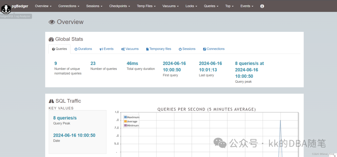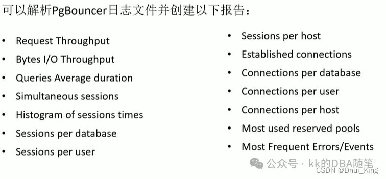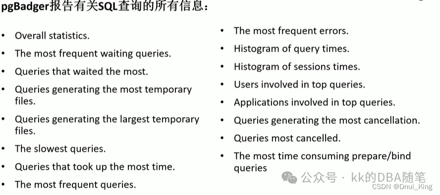 pgBadger(日志分析器)类似于 oracle 的 AWR 报告(基于 1 小时,一天,一周,一月的报告),以图形化的方式帮助 DBA 更方便的找到隐含问题。