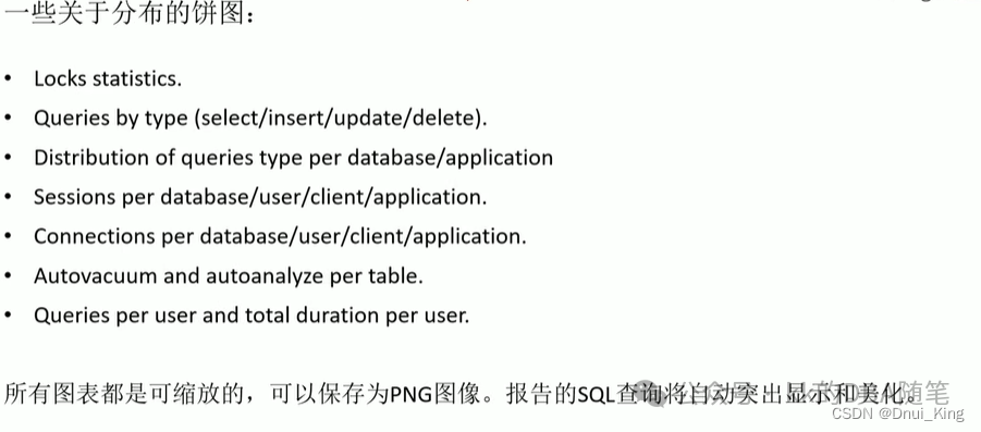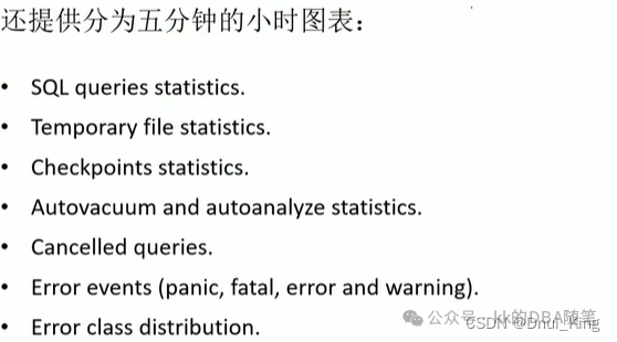 (oracle 使用 workload 那个包也可以进行 AWR 报告收集调整,但工作原理不同,oracle 是基于 MMON 收集的 AWR 快照,PG 则是分析日志但生成的都是 html 类型的文件)。