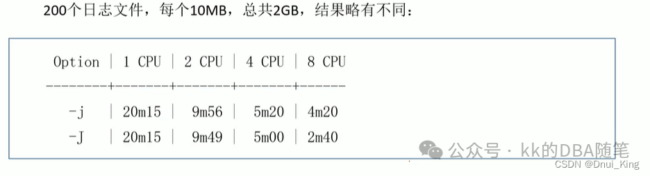 方式一:当有许多小的日志文件和许多 CPU 时, 一次将一个内核专用于ー个日志文件会更快要启用此行为, 必须改用 - N 选项。对于每个 10MB 的 200 个日志文件,-J 选项的使用开始变得非常有效, 有 8 个内核。使用此方法, 您将确保不会丢失报表中的任何查询。个在服务器上完成的基准测试, 有 8 个 CPU 和 9.5GB 的单个文件。