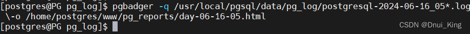 pgbadger -q /usr/local/pgsql/data/pg_log/postgresql-2024-06-16_05*.log \-o /home/postgres/www/pg_reports/day-06-16-05.html
