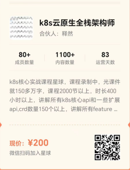 k8s核心实战课程星球,课程录制中,光课件就150多万字,课程2000节以上,时长400小时以上,讲解所有k8s核心api和一些扩展api,crd数量150个以上,讲解所有feature gate. 本星球会把录制的所有课程都放出来,包括后续要录的100多门云原生课程,费用首次只要200后续续费很便宜,相当于你买了一个的会员,就能享受到所有课程服务