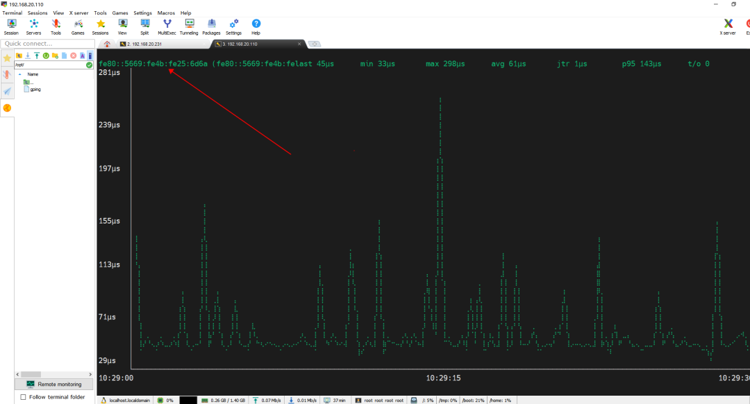 1、实时图形化显示:gping使用ASCII字符绘制的图表实时更新,能够直观地展示每秒的网络延迟变化,使网络性能的变化一目了然。