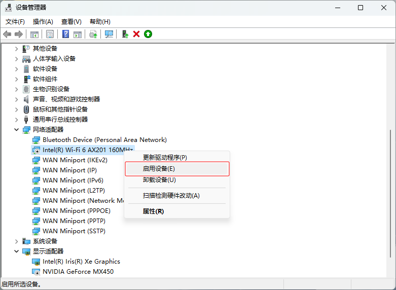 驱动禁用操作步骤:如果网卡驱动提示禁用,我们只要右击被禁用的设备,点击启动设备即可。