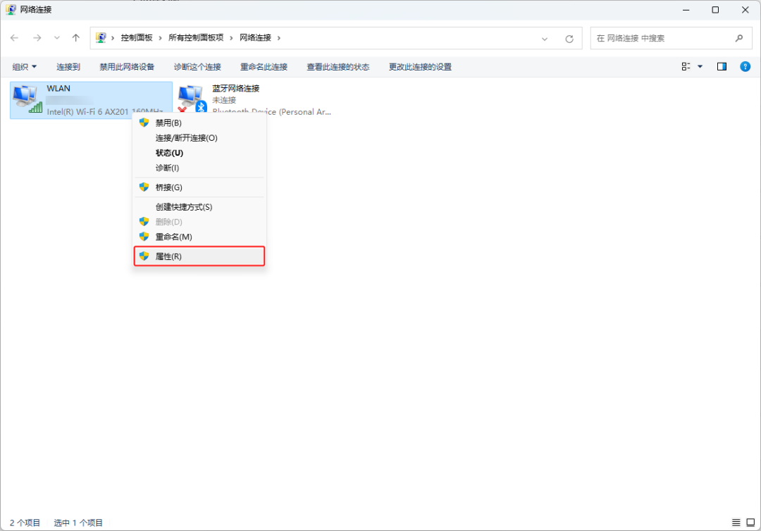 右键WLAN选择属性,如果电脑使用的是有线网,选择以太网。